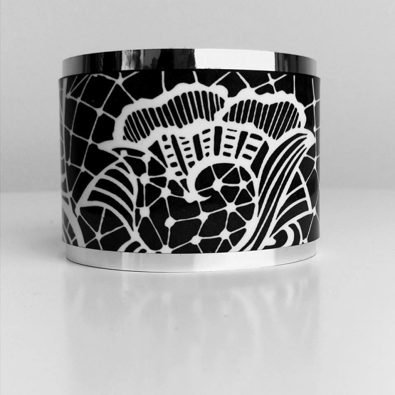 Hand made from a combination of mirror leatherette and graphic printed steel. The bracelet is light and pleasant to wear. The scope is flexible. Available in cute packaging.