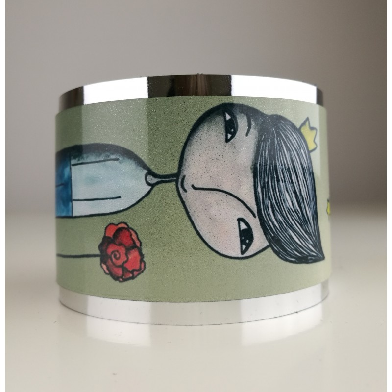 Hand made from a combination of mirror leatherette and graphic printed steel. The bracelet is light and pleasant to wear. The scope is flexible. Available in cute packaging. Width approx: 5 cm.