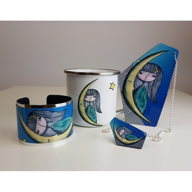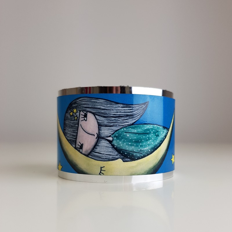 Hand made from a combination of mirror leatherette and graphic printed steel. The bracelet is light and pleasant to wear. The scope is flexible. Available in cute packaging. Width approx: 5 cm.