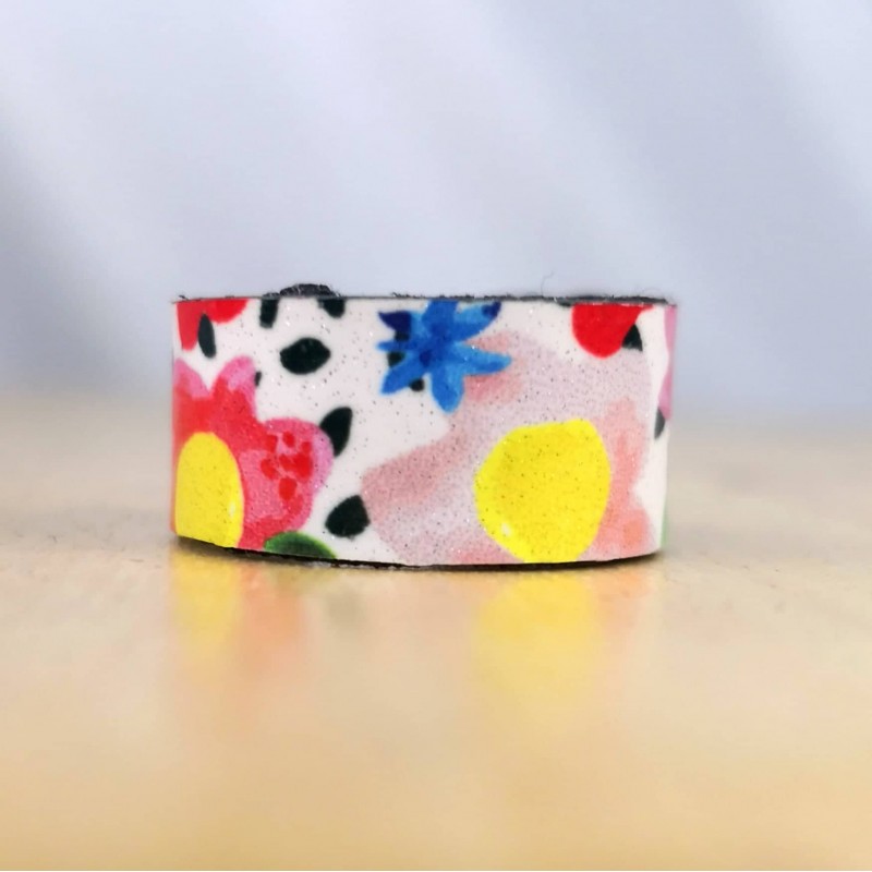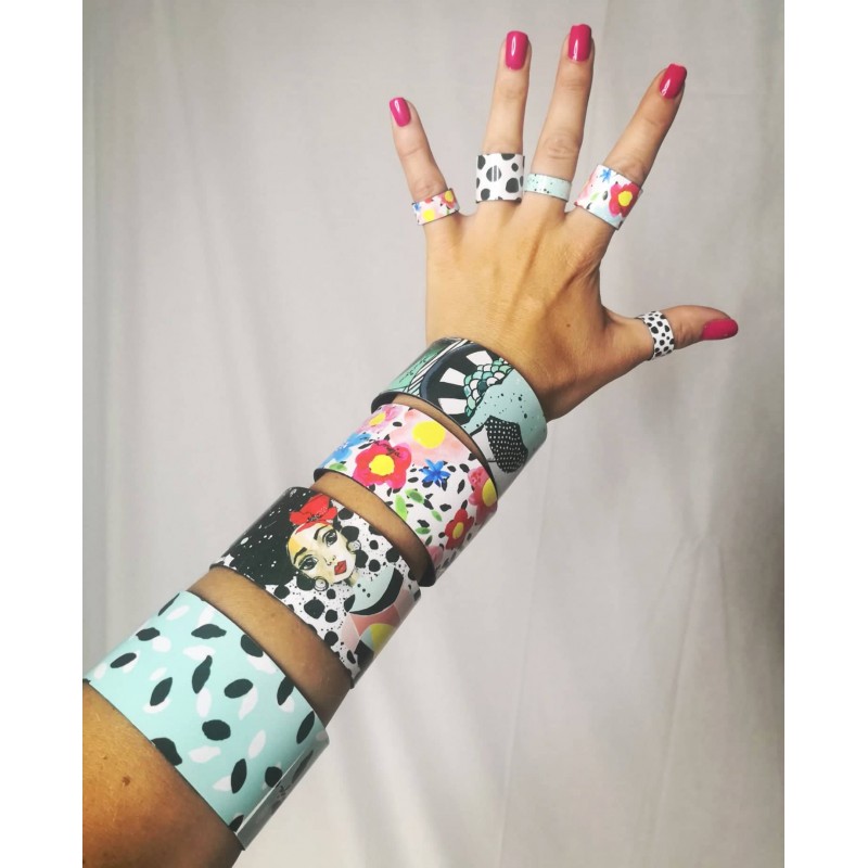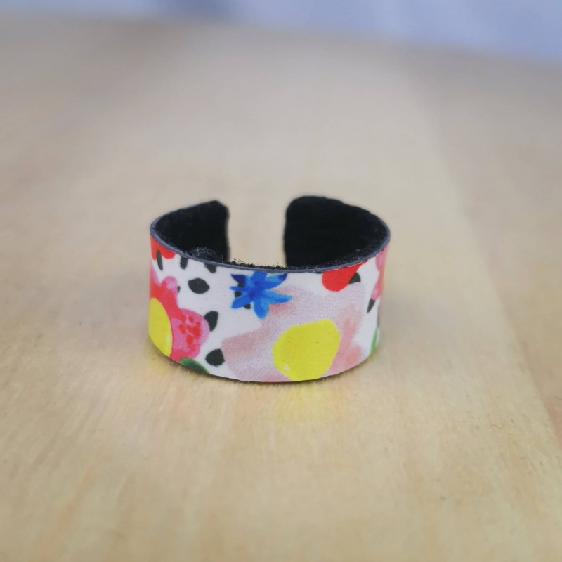 Ring in combination of black felt and graphic printed steel. The ring is adjustable size that it fully fit to your finger. Size approx 2,2 cm.