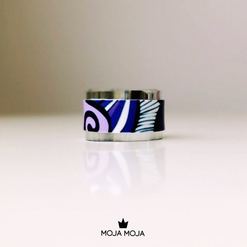 Ring is made from pleasant, textile lined mirror leatherette and graphic printed steel. The ring is adjustable size that it fully fit to your finger. Width: 1,2 cm.