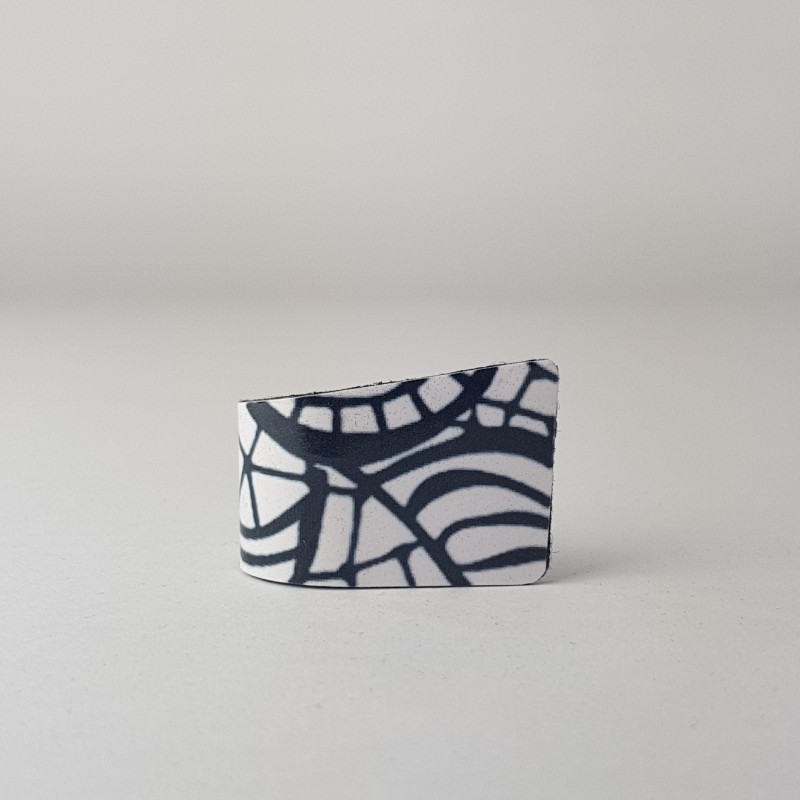 Ring in combination of black felt and graphic printed steel. The ring is adjustable size that it fully fit to your finger. Size approx 2,2 cm.