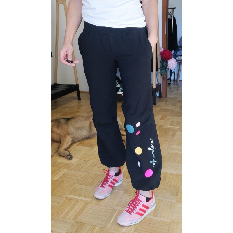 Udobne trenirkaste hlače iz bombažne prevešanke z žepi in patenti spodaj ter vv pasu... potiskane s pikami na levi hlačnici.