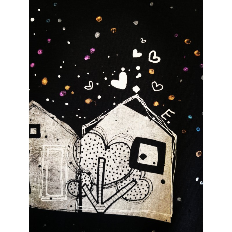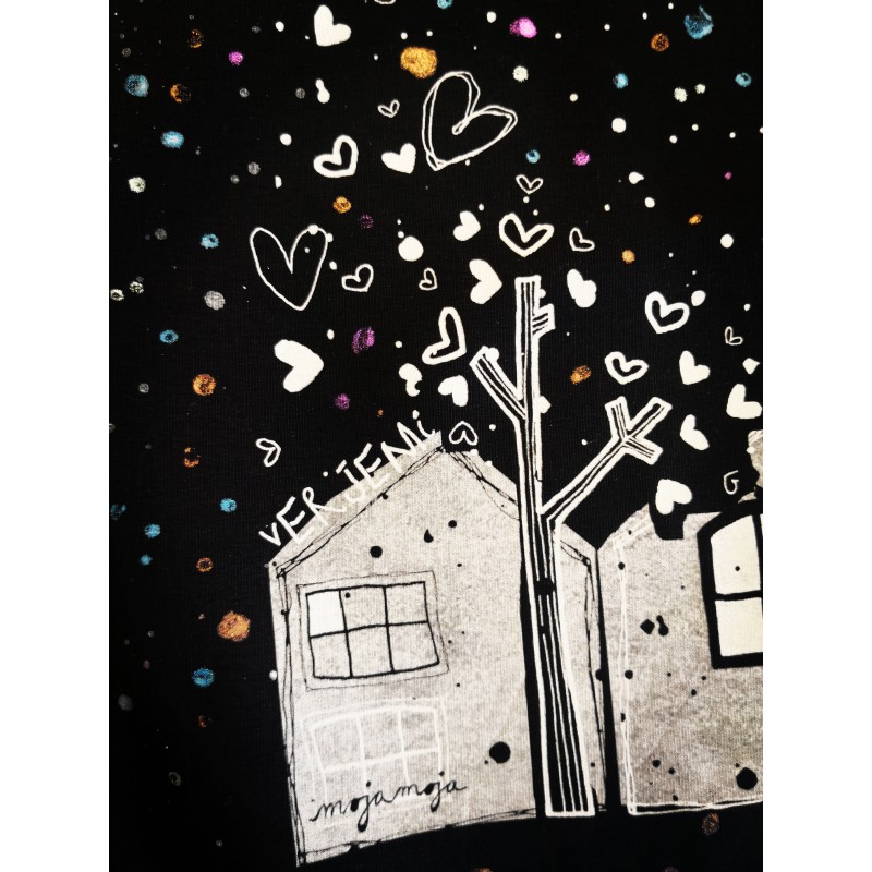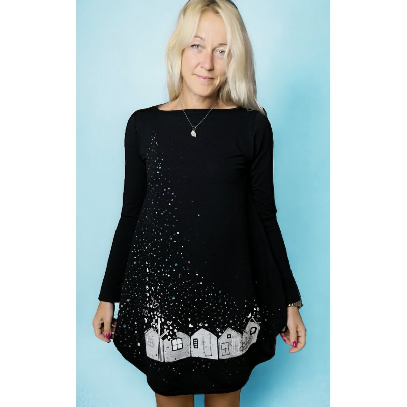 Balončkasta obleka z dolgimi rokavi v črni barvi, s potiskom ilustracije Verjemi vase. Dodan je ročni potisk bleščečih pik.