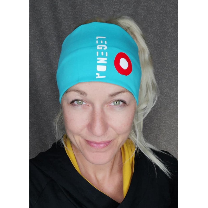 Turkizen trak za ušesa Legenda z markacijo, iz udobne prevešanke. Širina 12 cm, obseg traku 52 cm.
