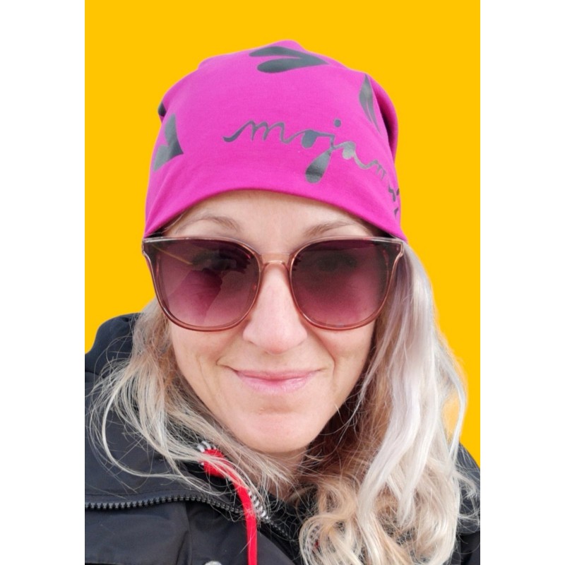 Viola (tista lepa živa) kapa s trakcem (luknja za čop), potiskana s črnimi srčki in mojamoja. Obseg (kape, ne glae...kapa se raztegne, da lepo oprime ;): 52 cm.