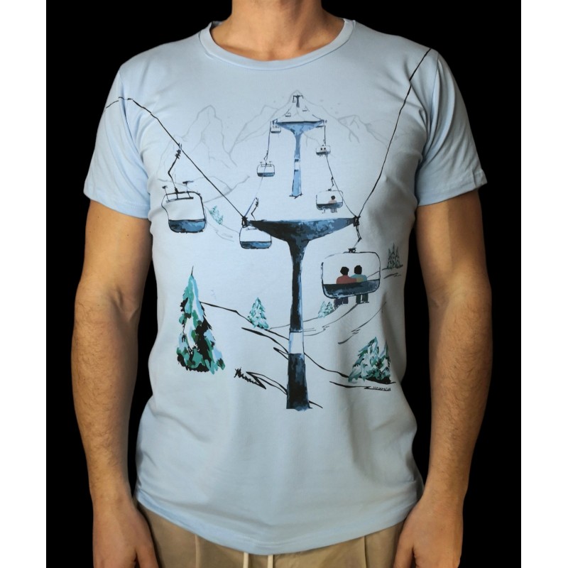 Črna majica iz udobnega bombaža potiskana z ilustracijo Sedežnica in ročno pobarvana.