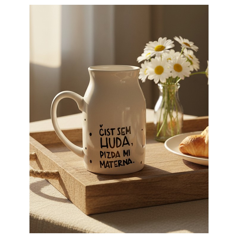 Keramični lonček s potiskom Čist sem huda, pizda mi materna. Prostornina cca 4,5 dcl.