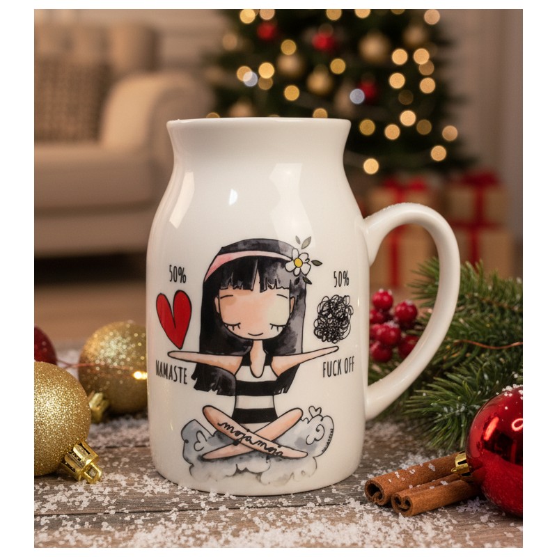 Keramični lonček s potiskom Life is all about balance: 50% namaste 50% fu*k off. Prostornina cca 4,5 dcl.
