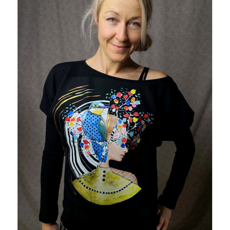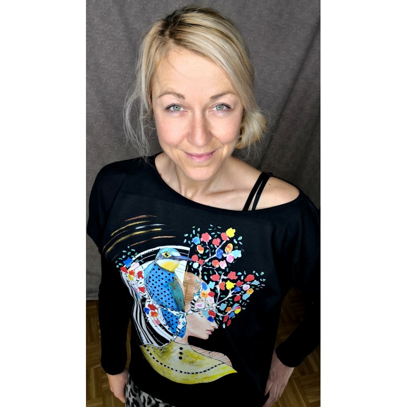 Širše krojena črna majčka z dolgimi oprijetimi rokavi, s potiskom Let go. Dodan ročni bleščeč potisk.