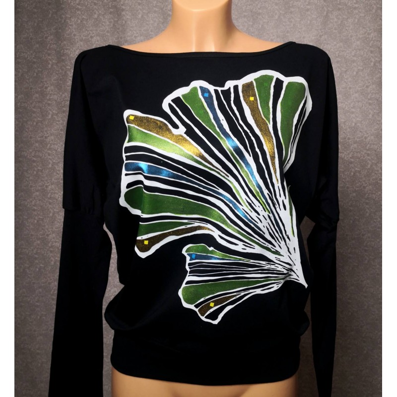Širše krojena črna majčka z dolgimi oprijetimi rokavi, s potiskom. Dodan ročni bleščeč tisk.