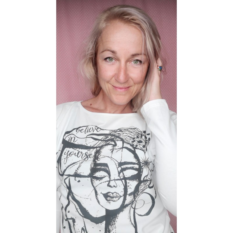 Širše krojena bela majčka z dolgimi oprijetimi rokavi, s potiskom avtorske ilustracije Believe in yourself..