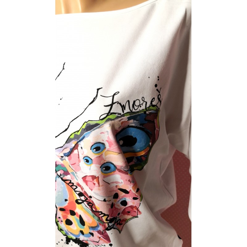 Širše krojena bela majčka z dolgimi oprijetimi rokavi, s potiskom avtorske ilustracije Zmoreš.
