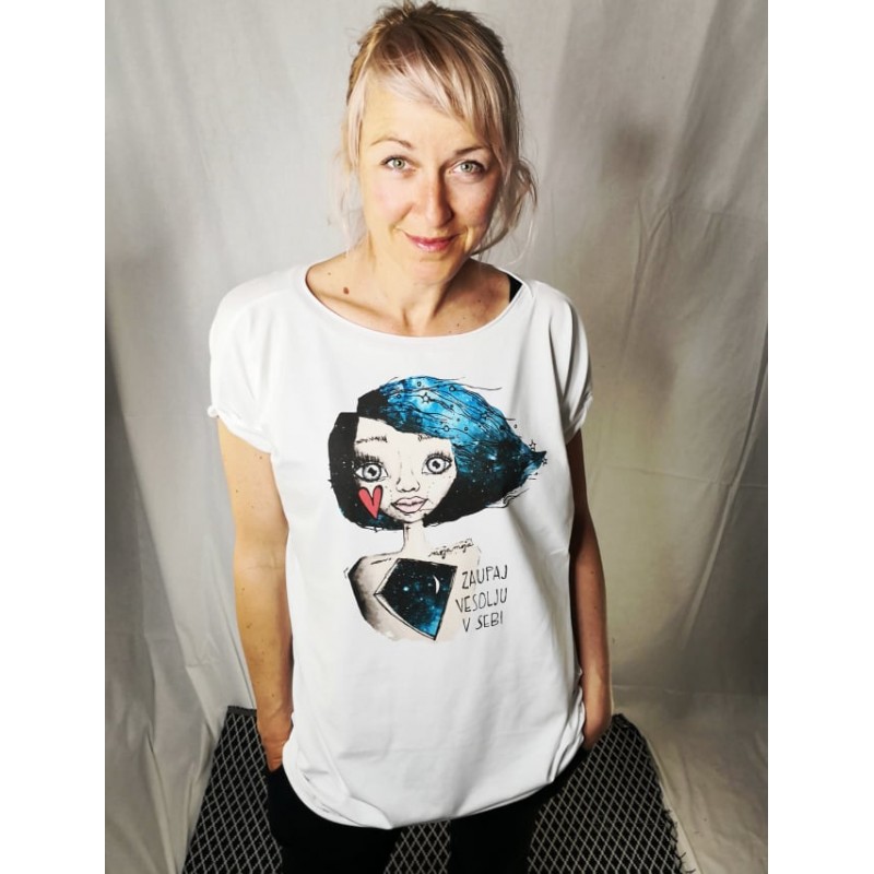 Udobna in prevelika majica s potiskom Zaupaj vesolju v sebi. Rahlo asimetrična z dvemi gubicami na levi strani.