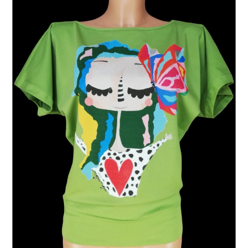 Udobna, netopirčkasta, širše krojena majčka iz zelenega bombažnega jerseya, s potiskom punčke.