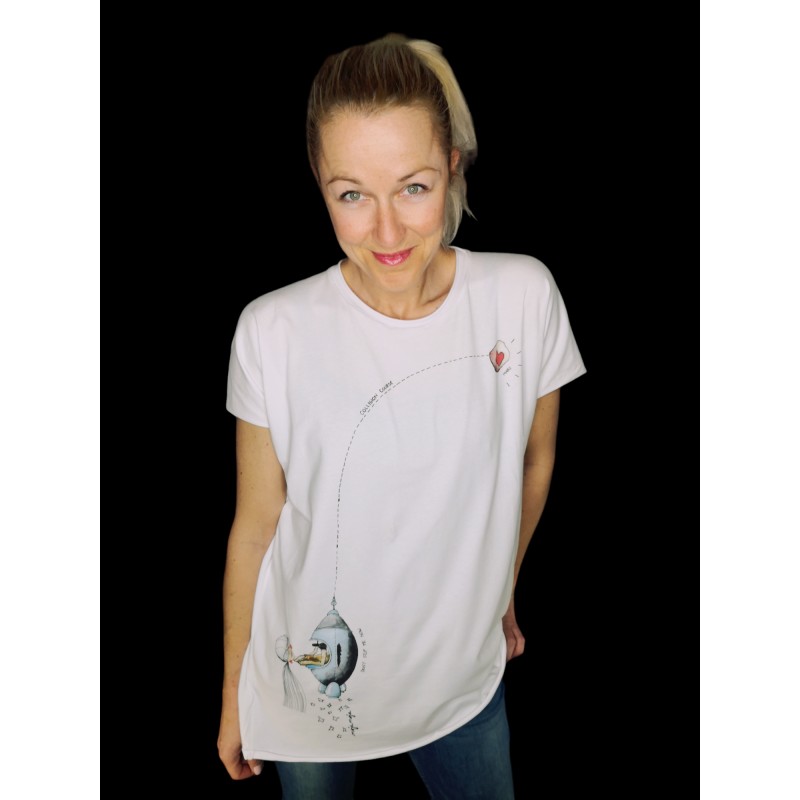 Udobna in prevelika bela majica s potiskom ilustracije Don't stop me now.