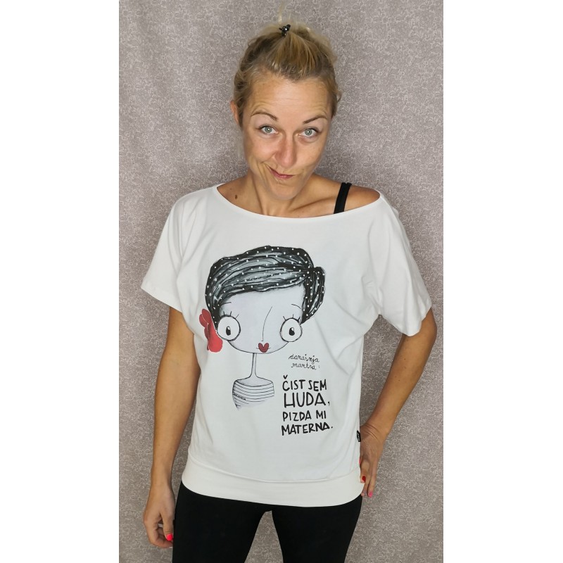 Udobna, netopirčkasta, širše krojena majčka iz bombažnega jerseya v beli barvi s potiskom ilustracije Čist huda.