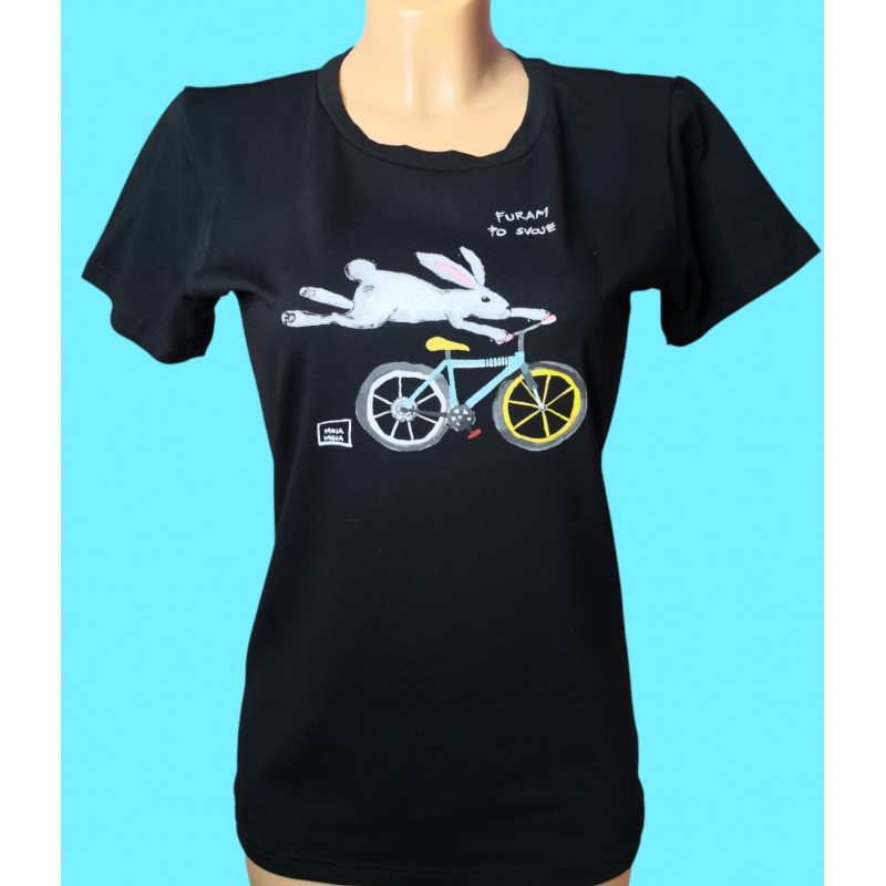 Črna bombažna majčka z ilustracijo zajčka na biciklu, z napisom Furam po svoje.
