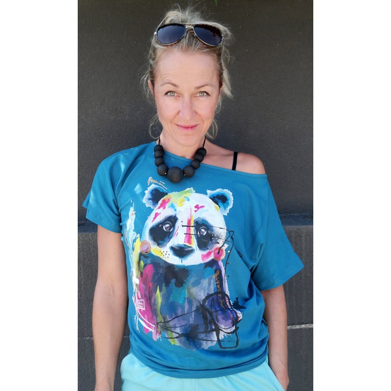 Udobna, netopirčkasta, širše krojena majčka iz bombažnega jerseya v modri barvi s potiskom ilustracije Panda.