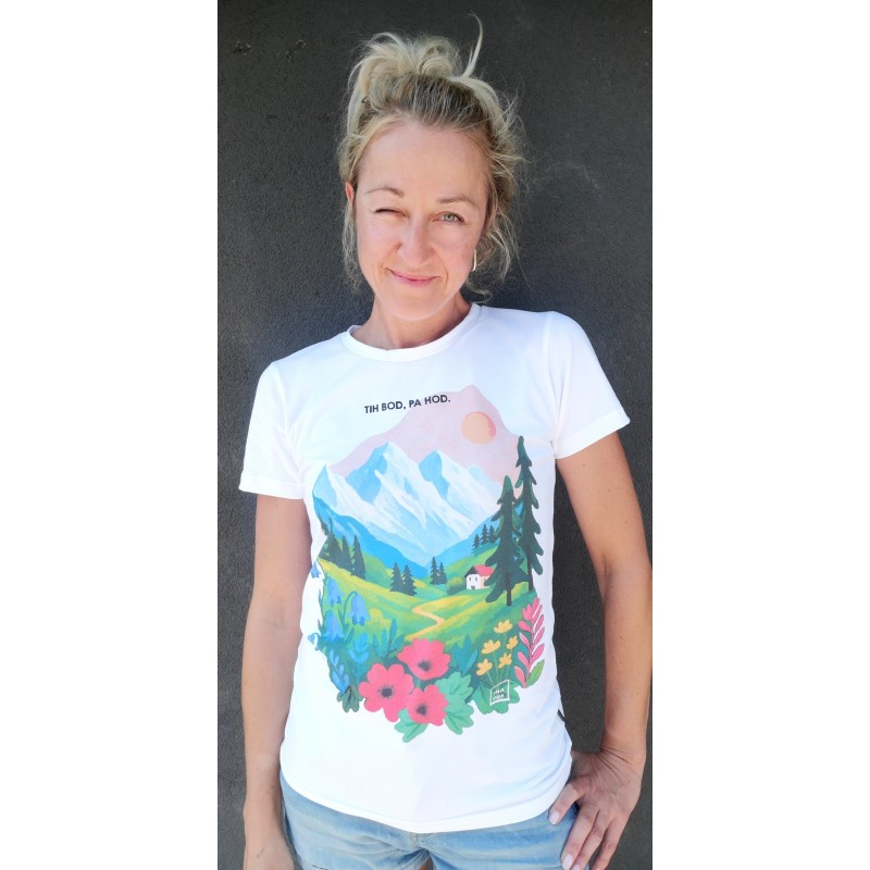 Bela bombažna majčka s potiskom Krnice in napisom Tih bod, pa hod. Lahko tudi brez napisa - napišite v komentar ob naročilu.