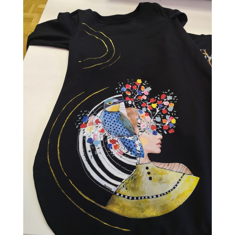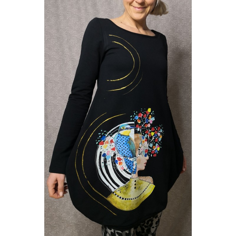 Balončkasta obleka z dolgim rokavom v črni barvi, s potiskom Let go. Dodan ročni bleščeč tisk.