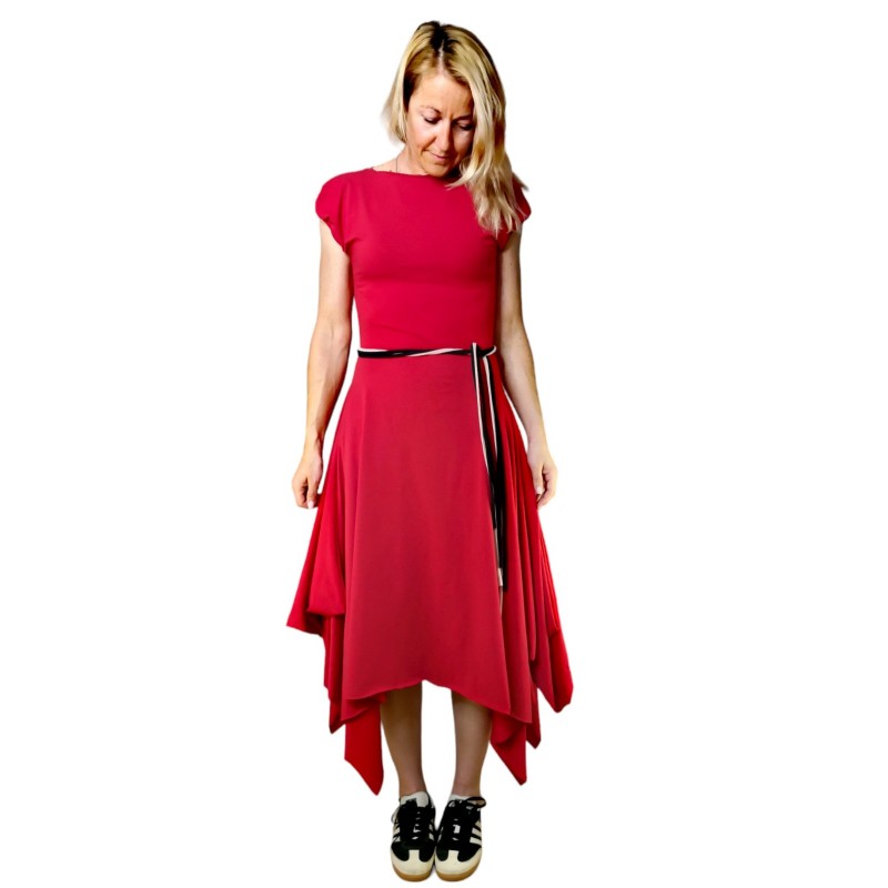 Udobna, ženstvena, asimetrična obleka iz bombažnega jerseya v rdeči barvi.