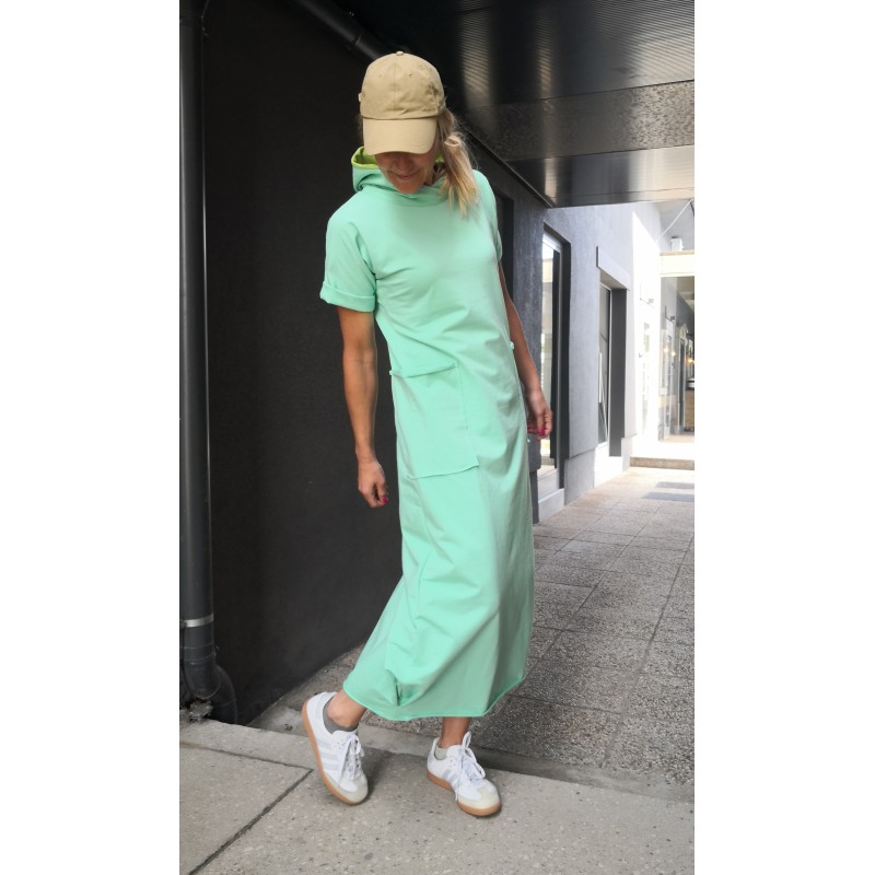 Udobna dolga obleka s kapuco, kratkimi rokavi in žepi.