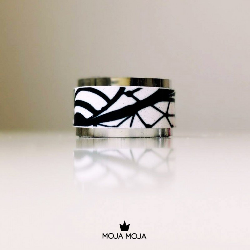 Narejen iz prijetnega, s tekstilom podloženega zrcalnega skaja in potiskanega jekla. Prstan se v obsegu širi in oža in tako povsem prilagodi vašemu prstu. Širina: 1,2cm