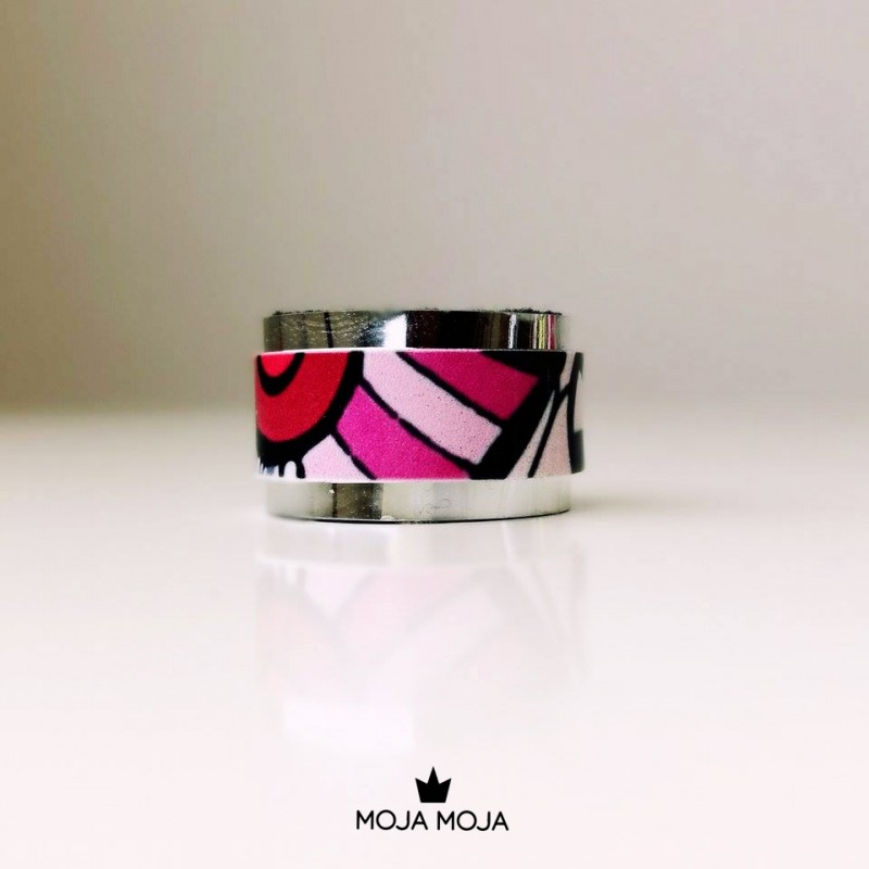 Narejen iz prijetnega, s tekstilom podloženega zrcalnega skaja in potiskanega jekla. Prstan se v obsegu širi in oža in tako povsem prilagodi vašemu prstu. Širina: 1,2cm