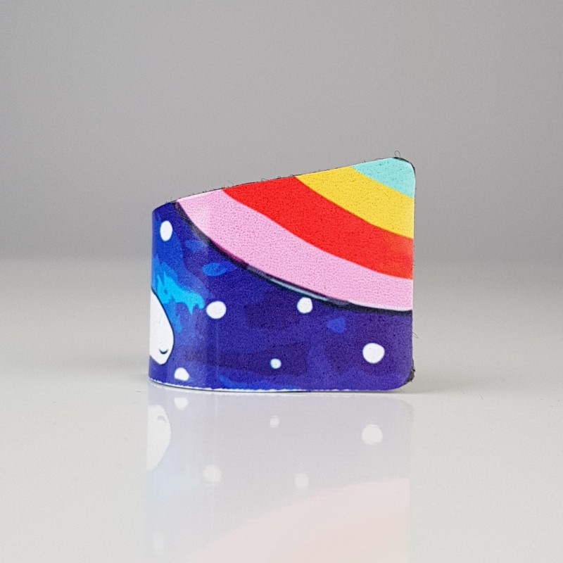 Narejen iz s tekstilom podloženega in potiskanega jekla. Prstan se v obsegu širi in oža in tako povsem prilagodi vašemu prstu.