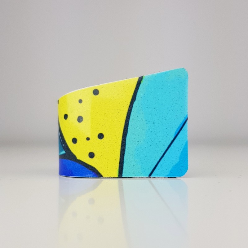 Narejen iz s tekstilom podloženega in potiskanega jekla. Prstan se v obsegu širi in oža in tako povsem prilagodi vašemu prstu.