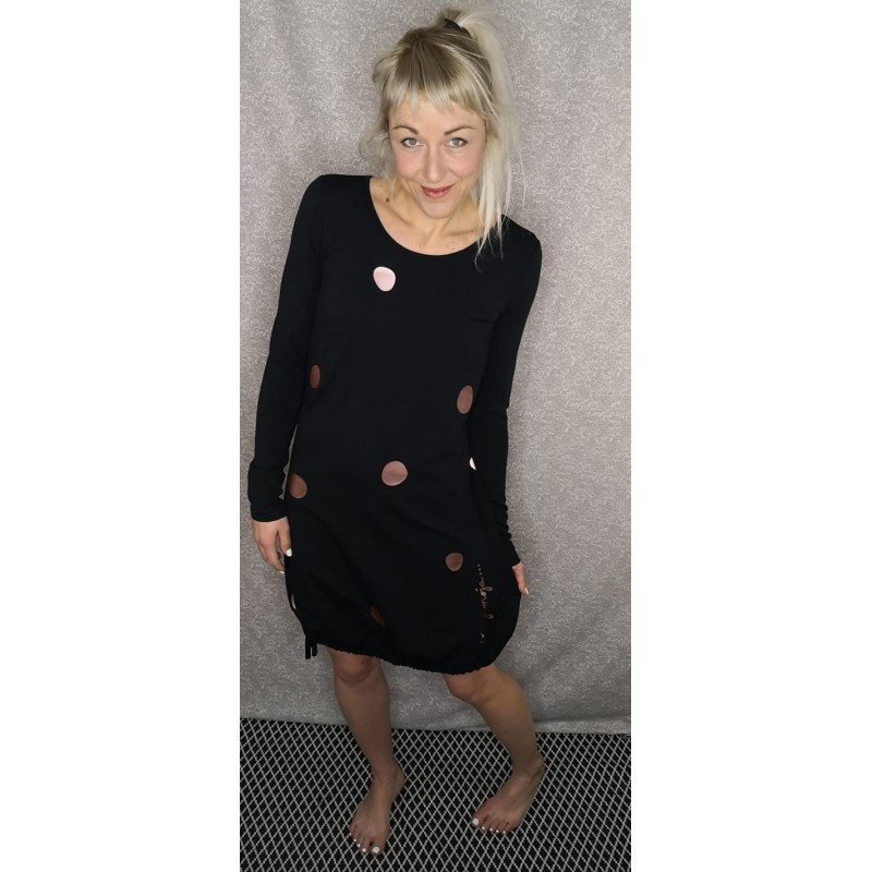 Črna obleka iz bombažne prevešanke, s potiskom pik v rosegold barvi.