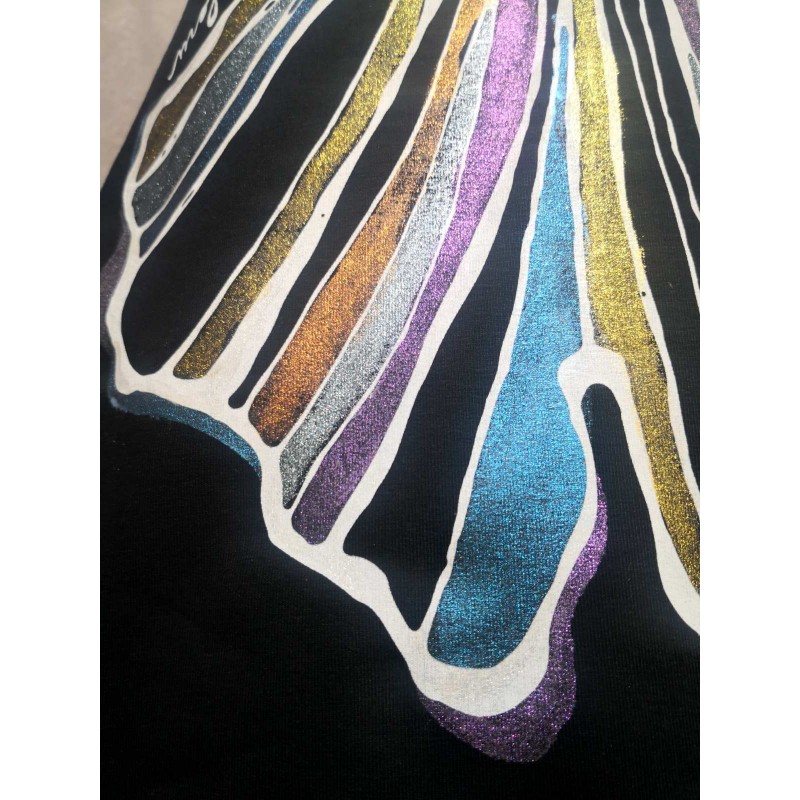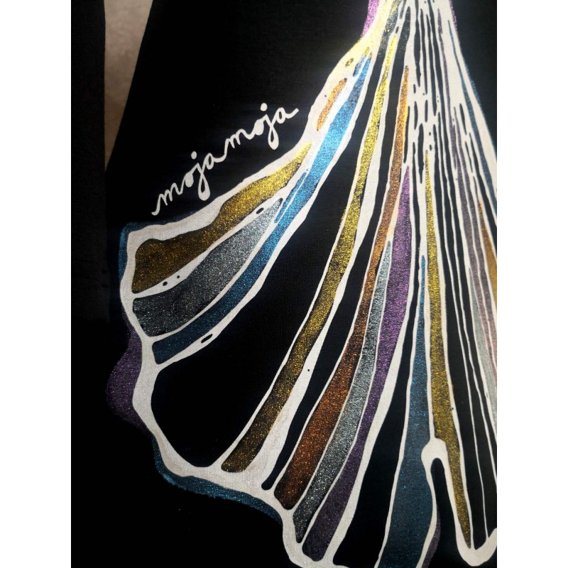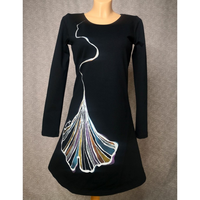 Črna obleka iz bombažne prevešanke, ročno porisana z bleščečimi barvami.