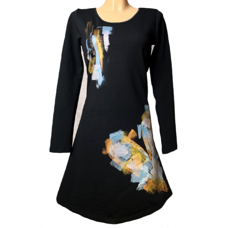 Črna obleka iz bombažne prevešanke, ročno porisana z bleščečimi barvami.