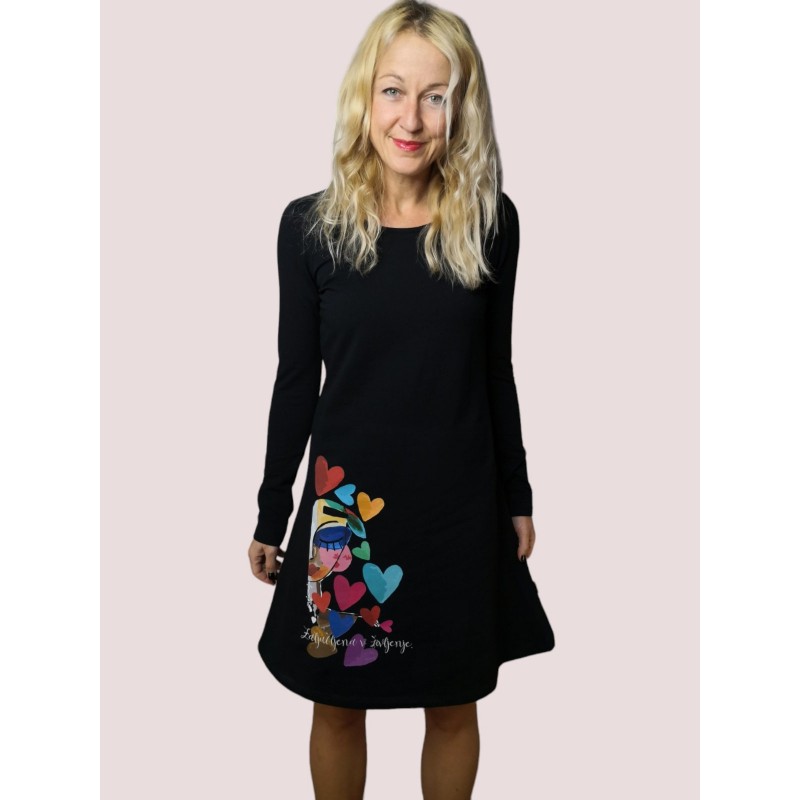 Črna obleka iz bombažne prevešanke z ilustracijo Zaljubljena v življenje.
