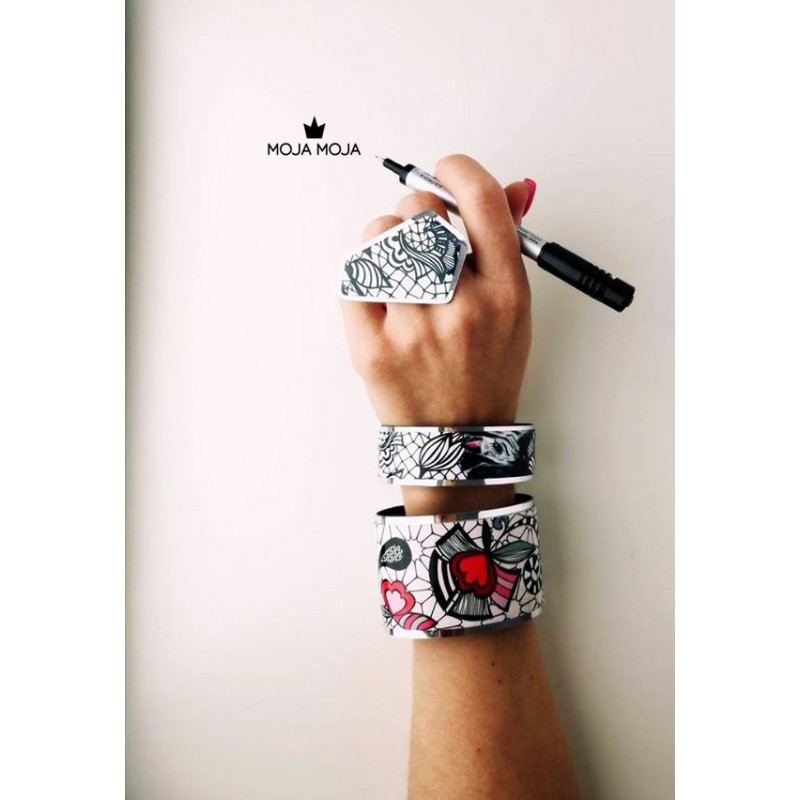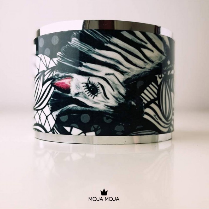 Ročno narejena iz kombinacije zrcalnega skaja in grafično potiskanega aluminija. Zapestnica je lahka in prijetna za nosit. Obseg je prilagodljiv. Na voljo v lični embalaži.